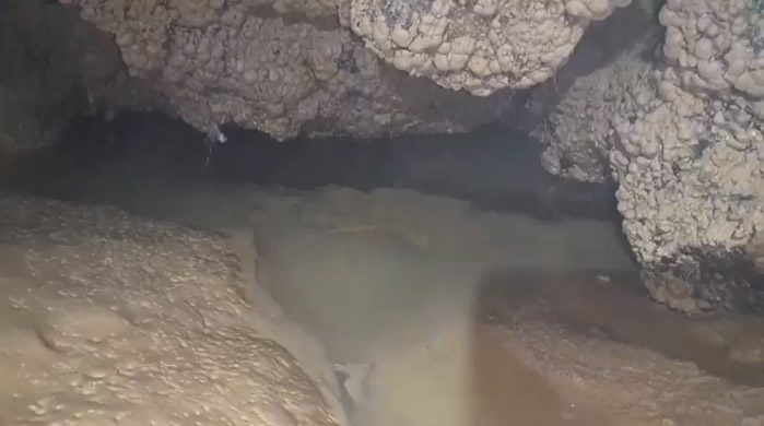 Samedi 12 juillet 2025 : (vestiaire après le Dernier Lac 0%, lac voûte basse entre le Camp de Base et l'approche du $1 0%, fond des Pyjamas 0%, débit mesuré 0,3 m³/s). Tout le courant d'air part vers galerie $8-$9. Au $8, la concrétion n'est pas immergée. (JA RB MF LP BR LP HV TA VS SG NV BP BR)